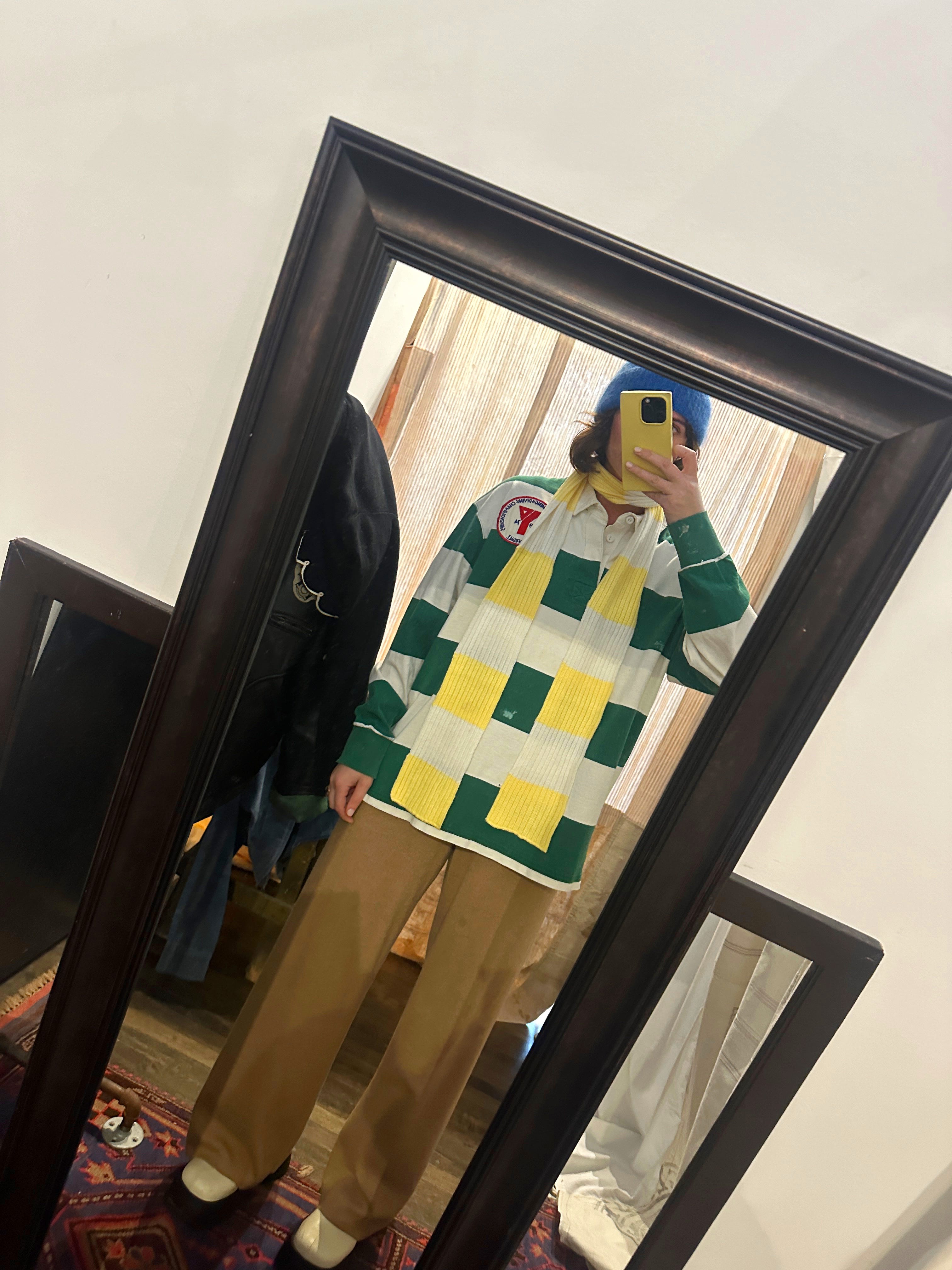 I didn’t end up purchasing the green & white one, and I REGRET it. I found another similar one on Etsy and searched for “vintage rugby.” I aimed for an oversized fit here. If you’re second-hand shopping, always have your measurements handy. I love the colors on this one.